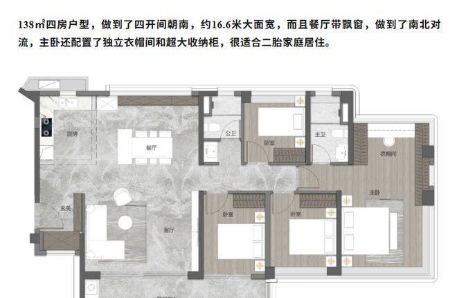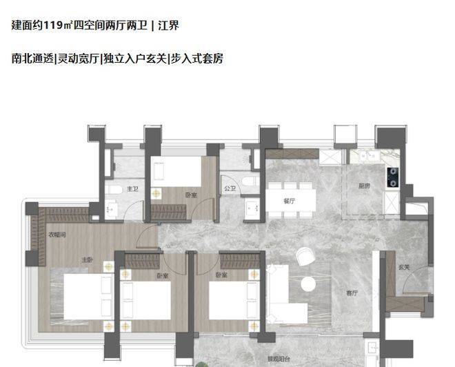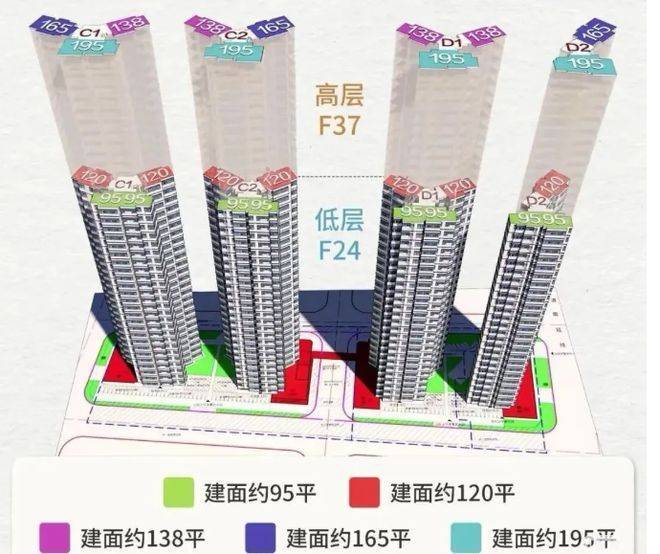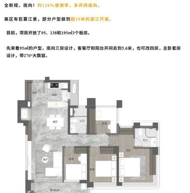 户型设计亮点十足,全新规设计,使用率超 120%,多开间南向。项目规划 4 栋楼,分高区和低区,梯户比和户型不同,满足不同需求。低区 2 - 24 层两梯四户,预测户型 90 - 120 - 160㎡;高区 25 - 37 层两梯三户,预测户型 120 - 160 - 190㎡,偏改善。95㎡户型,南向三房可改四房,客餐厅和阳台开间 5.6 米,主卧套房带 270° 大飘窗。119㎡四空间户型,南北通透,灵动宽厅,独立入户玄关。138㎡四房户型,四开间朝南,约 16.6 米大面宽,餐厅带飘窗南北对流,适合二胎家庭。195㎡大四房户型,阳台长约 8 米,LDK 客餐厅面积约 70 + 平,两侧观江面长达约 16 米,空间感十足,尽享江景。