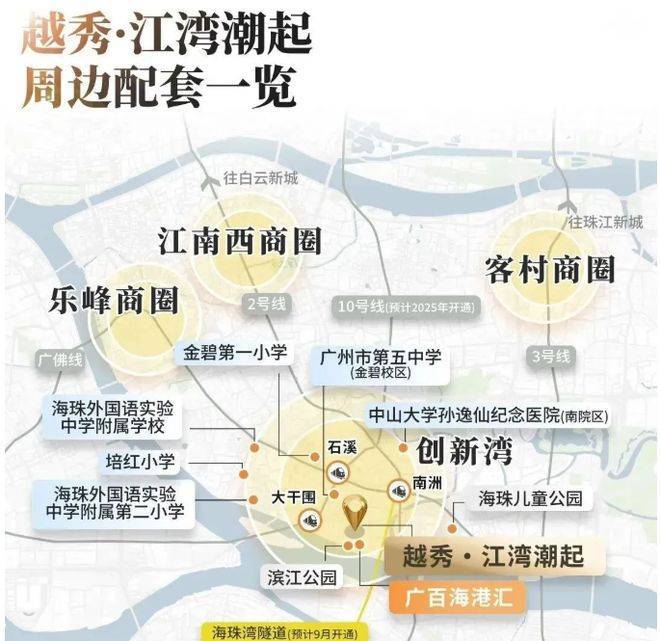 商业配套高端且完善,自带建面约 3.4 万㎡的商业 Mall,计划引入奢侈品旗舰店、五星级酒店、商务办公等,未来将融合全维度消费、购物场景,堪比香港海港城。周边还有广百海港城即将开业,以及东晓南、江南西、乐峰广场等商圈环绕,满足各种消费需求。自然景观与休闲配套优越,位于珠江后航道黄金岸线,享有南向一线宽阔江景,200m(百度地图测距)即可步行到江边,可进行露营、垂钓等多种休闲活动。还有占地约 1.7 万㎡的滨江公园,提供舒适的休闲空间。医疗方面,中山大学孙逸仙南院、中山大学附属第二医院、海珠区石溪中医院等为健康保驾护航。