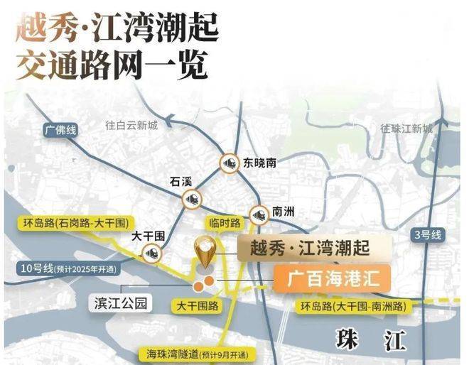 交通便利性十分突出。直线约 650 米(百度地图)处是已开通的 10 号线大干围站,可直达滨江东、五羊邨、珠江新城、体育西等市区核心板块,方便快捷。已开通的海珠湾隧道,到广州南站通勤仅约 15 分钟,满足商务出行需求。项目门口的环岛路(石岗路 - 大干围路段)今年会开通临时道路贯通,进一步提升板块通行效率,无论是日常通勤还是外出远行,都极为便利。