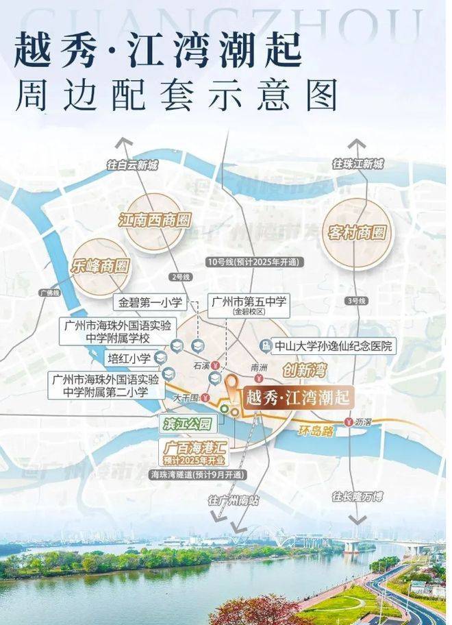 项目处于广州 3.0 滨江人居时代,有着 “巨幕江景”“超级底盘”“先锋产品” 的王炸组合。交通超便利,临近已开通的 10 号线大干围站,还有海珠湾隧道和即将开通的环岛路临时道路。教育资源丰富,自带 66 班完全中学配套,周边学校林立。