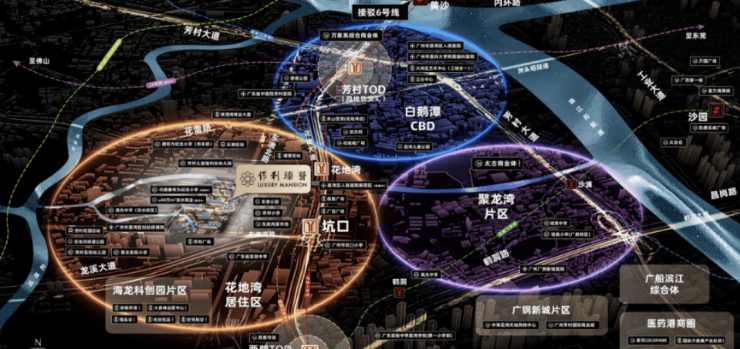 白鹅潭作为广州五大世界级地标商圈之一,是老城区滨水生活与城市核心价值集中的代表区域。周边发展持续加速,东侧聚龙湾商业和滨水配套不断完善,北侧白鹅潭CBD建设日益成熟。项目区域拥有低密度居住优势,同时兼具成熟商业、医疗和教育资源,使其未来价值潜力巨大。