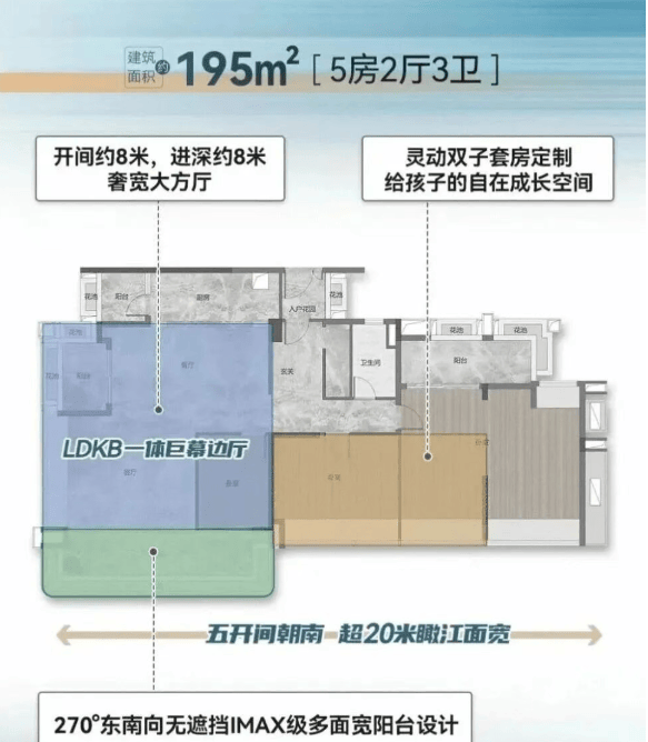 建面约195㎡大四房:约8米奢阔阳台,LDK公共区域超70㎡,双侧观江视野叠加,营造出极具震撼力的社交与生活场域。
