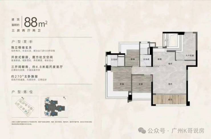 “中央公园”,紧邻大脚印公园,距离地铁约500米,紧邻学校、酒店,户型涵盖75-88㎡三房,105、125、142㎡四房。