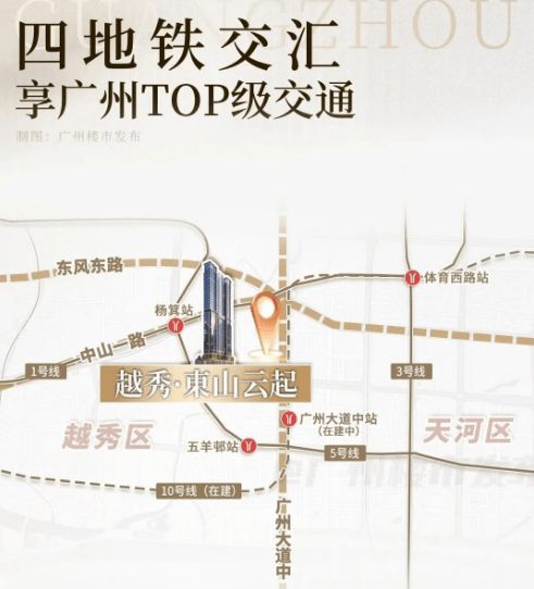 项目距离地铁杨箕站约700米,五羊邨站和体育西路站约800米,步行即可到达。预计今年通车的10号线将在广州大道中设站,距离项目仅400米左右。驾车出行同样便捷,通过中山一立交可以快速连接东风东路、中山一路和内环路,轻松抵达主城区各个角落。