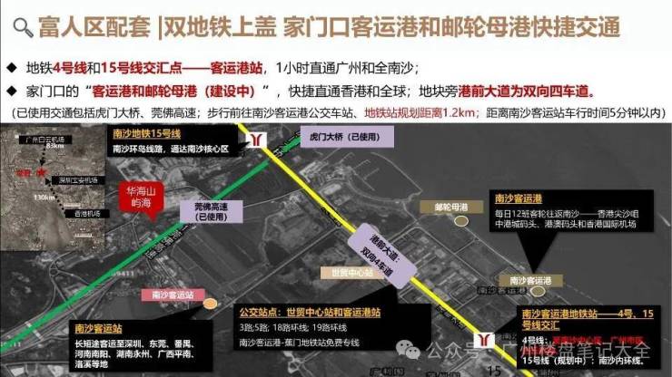 高速出行方面,项目5分钟可接驳虎门高速,30分钟可达广州番禺、东莞虎门,45分钟可达广州天河、深圳宝安。水运交通方面,项目5分钟可达南沙客运站,10分钟可达南沙邮轮母港,从南沙邮轮母港可直达香港,全程仅需1.5小时。此外,地铁18号线、22号线正在建设中,建成后将进一步完善区域轨道交通网络,实现30分钟直达广州天河、深圳前海。完善的交通网络,让业主轻松畅行粤港澳大湾区,享受便捷高效的都市生活。