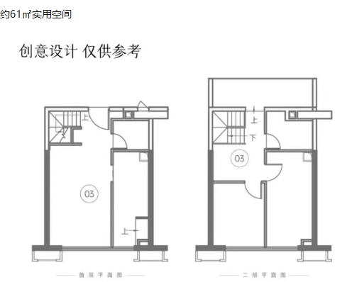 45㎡LOFT:上下两层,一层设开放式厨房+卫生间,二层为睡眠区,实用面积约60–70㎡;