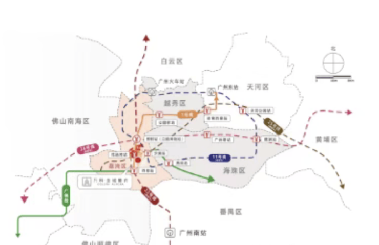 路网:坐拥“三横五纵”黄金路网(花地大道、芳村大道、鹤洞路+珠江隧道、洲头咀隧道、如意坊隧道等),15分钟直达天河商务区,30分钟覆盖越秀、海珠、白云核心区。