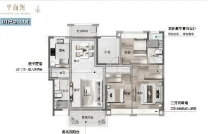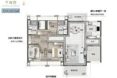 约118㎡户型:双阳台双景观设计,空间宽敞,布局精细,适合二胎或三胎家庭。