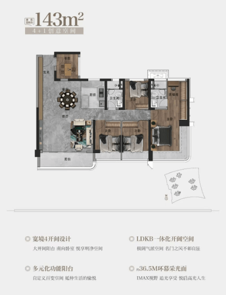 143㎡四房:朝东南,配备约36.5米环幕采光面、多元化功能阳台。