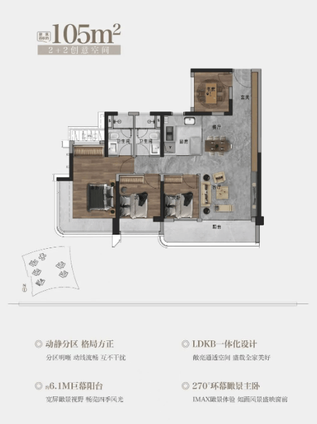 105㎡三房:两个户型分别朝西南和东北,均配备6.1米巨幕阳台、LDKB一体化设计。