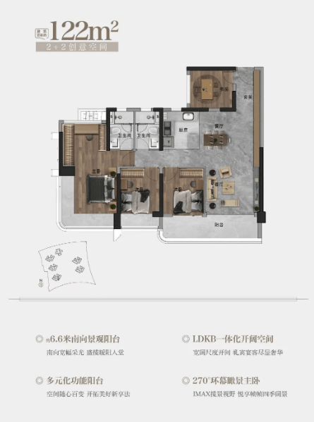 122㎡四房:朝东南,配备6.6米南向景观阳台、多元化功能阳台。