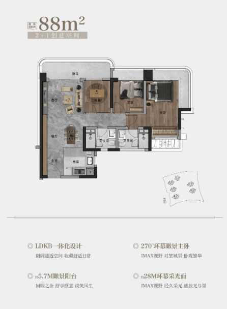 88㎡两房:朝西北,配备5.7米巨幕阳台、LDKB一体化设计。
