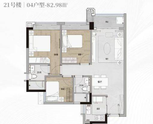 户型空间方面,项目住宅产品以三房与四房户型为主,采用独立玄关、客餐厅连接、功能分区明确的室内结构。部分户型采用双卫设计,以适应家庭成员使用需求。同时,户型设计注重区域分布完整性,使公共空间与私密空间分布合理。部分户型具备南向采光面或景观朝向,使自然光线与景观资源进入室内空间。