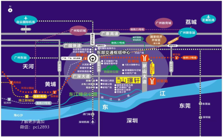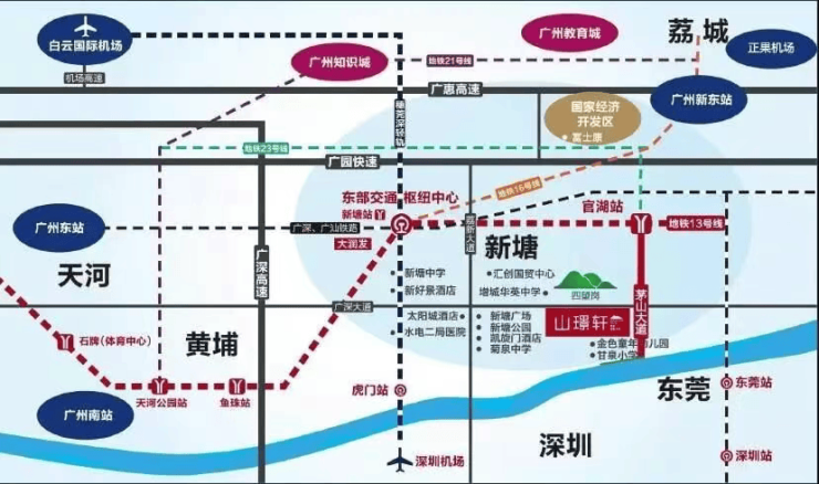 项目坐落于增城区新塘镇广深大道东 107 号,地处广州东部交通枢纽中心核心辐射圈,交通网络四通八达。轨道交通方面,距离地铁 13 号线官湖站约 1.5 公里,依托 13 号线及规划中的多条地铁线路,可快速通达广州中心城区与大湾区各城市;铁路枢纽方面,紧邻京九高铁新塘站,通过广汕高铁、穗深城际等线路,实现跨城通勤高效便捷。地面交通同样便捷,临近双向十二车道的茅山大道,搭配新塘 3/4/6/8 路、广增 4 线等公交线路,京港澳高速、广深沿江高速环绕,构建起地铁、高铁、公交、高速多维一体的交通体系,30 分钟通达大湾区核心城市。