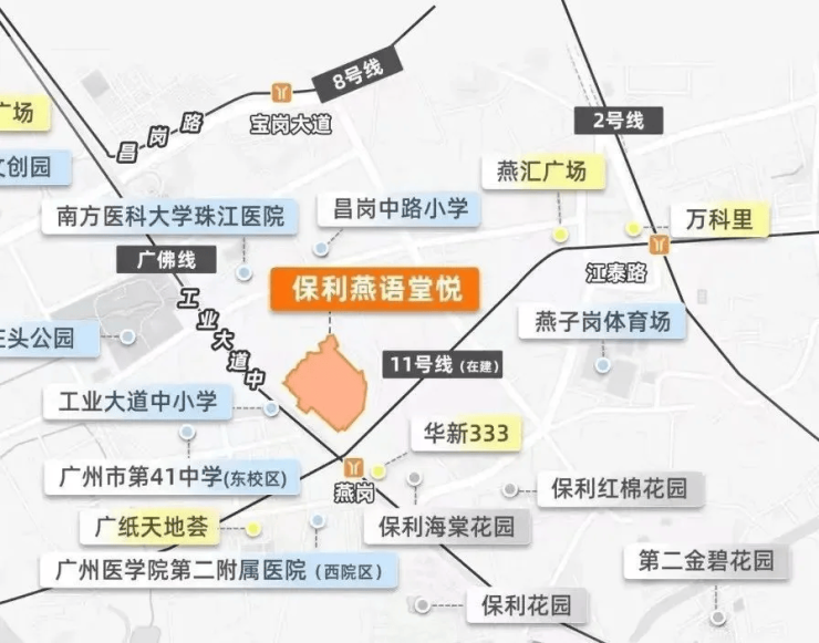 保利燕语堂悦坐落于海珠西工业大道中核心地段,处于广州“一江两岸三带”发展战略的重要节点,享受老城区成熟配套与珠江后航道发展的双重红利。根据《广州市海珠区国民经济和社会发展第十四个五年规划和2035年远景目标纲要》官方文件,海珠区将重点打造“一区一谷一圈”发展格局,其中保利燕语堂悦所在的工业大道中板块被纳入“海珠西部活力圈”,重点发展现代商贸、文化创意等产业,区域发展潜力巨大。