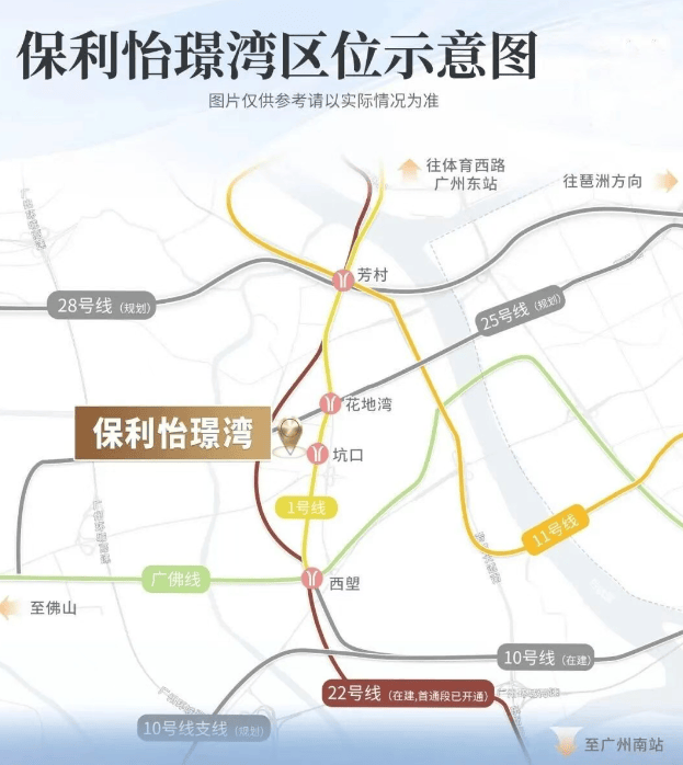 距离地铁1号线坑口站仅约600米,步行即可到达。通过芳村 TOD 换乘 11 号线环线,或在西塱 TOD 换乘广佛线和 10 号线,可快速通达珠江新城等重要区域。
