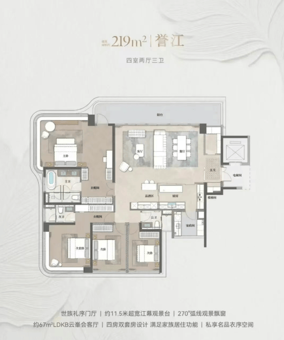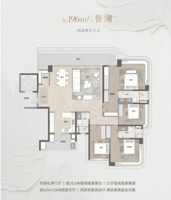 在产品设计与户型研发上,能建天誉府充分运用了广州最新的建筑设计规范,打造出了一系列令人眼前一亮的大平层作品。项目主推的户型面积段涵盖133平方米至228平方米,每一款户型都经过精心打磨,旨在最大化地利用空间并引入自然景观。其中,133平方米的四室两厅两卫户型,采用了纯南向园景单边户的设计,确保了采光与通风的最佳效果。该户型拥有长达6.8米的超阔观景台,配合LDKB(客厅、餐厅、厨房、阳台)一体化设计,使得公共活动空间显得异常宽敞明亮,既满足了家庭聚会的社交需求,又兼顾了日常生活的实用性,非常适合首次改善型客群。而对于追求极致奢华体验的买家,205平方米的四室两厅三卫户型则提供了一个约42平方米的洄游方厅,这种设计打破了传统客厅的布局限制,增强了空间的流动感与通透感。该户型还配备了10.5米的奢阔观景露台,让室内外空间得以无限延伸,居住者可以随时亲近自然,享受阳光与微风。顶级的228平方米四室两厅三卫户型,更是将豪宅的气派演绎到了极致,配有约11.5米的超宽江幕观景台,以及约67平方米的LDKB云峯会客厅。双套房的设计充分考虑了多代同堂家庭的居住习惯,既保证了主人的私密性,又照顾到了长辈或客人的居住舒适度。所有户型均遵循高窗地比的设计理念,窗地比达到了0.36,远超行业平均水平,这意味着更多的玻璃幕墙被应用于建筑立面,从而实现了270度的环幕视野。这种设计不仅让室内光线更加充足,更重要的是将窗外的江景、园景毫无保留地引入室内,让居住者在任何角落都能感受到自然的馈赠。梯户比方面,项目采用了2T3的设计,并结合私梯入户的配置,既保证了电梯使用的便捷性,又极大地提升了居住的私密性与尊贵感。高达约100%的使用率,使得这些大户型在实际使用中显得更加宽敞,消除了公摊面积带来的浪费感。主卧开间可达6.8米,配备了独立的衣帽间和豪华卫生间,营造出酒店般的居住体验。整体而言,能建天誉府的户型设计不仅在尺度上令人震撼,更在细节上体现了对人性的关怀,真正做到了空间与景观的完美融合。