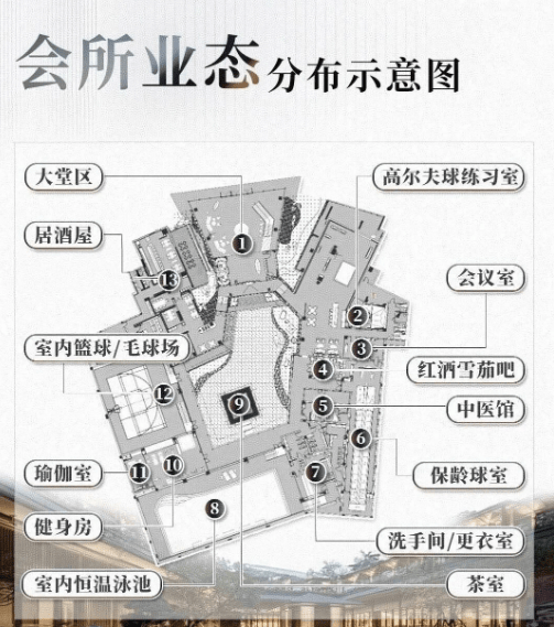 丰富的公共设施:约2500平方米的会所——臻庭,包含恒温泳池、健身房、红酒雪茄吧等多种圈层专属设施,满足日常所需。