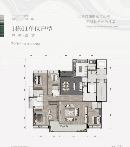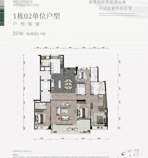 高端大平层:建面约260-350平方米的巨幕畔山大平层,每户层高约3.2~3.5米,奢阔空间带来呼吸感和舒展性。