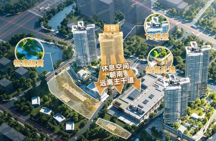 嘉悦云启的3栋楼采用了"T5楼栋+全南向布局”的科学设计。这种设计将休憩空间与公共区域都朝向南侧,直面绿化廊道和河道。同时,楼间距奢阔,有效隔离了主干道的车流噪音,保证了室内的安静。