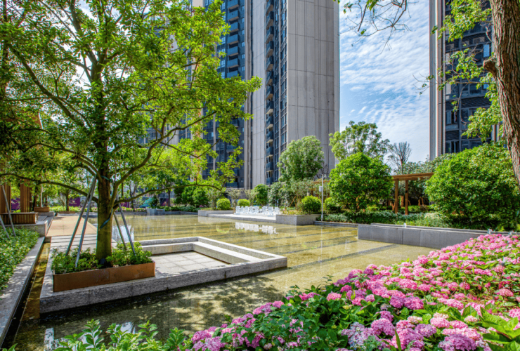 对称分布:归家轴线上对称分布着秋枫、桂花树等名贵乔木,四季有景,花香四溢,营造出“步步生花”的归家仪式感。