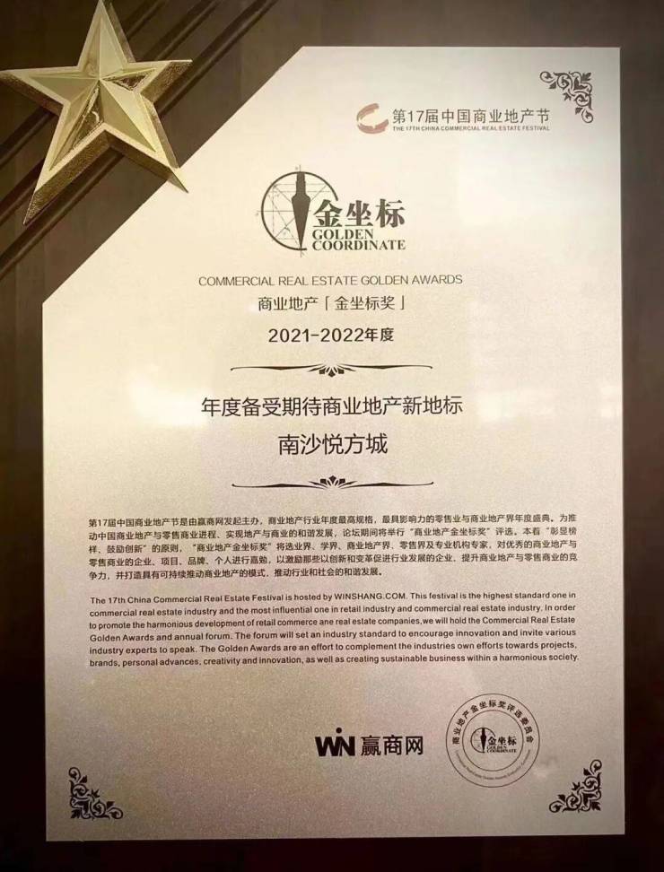 悦方城获得第17届中国商业地产节奖”年度备受期待商业新地标奖“。