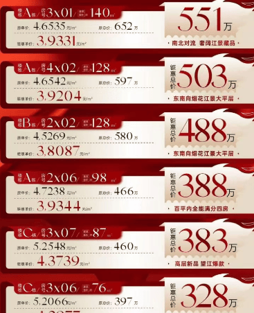 140㎡大四房则面向改善客群,搭配项目半围合式 "风车" 状楼栋布局,实现南向采光最大化,部分户型可享江景或园景双重景观。所有户型均采用人性化设计,搭配 750*1500mm 西班牙岩板地面、全屋定制护墙板等高品质交标,博世燃气灶、洗碗机、松下厨房空调等品牌家电直接赠送,既提升居住舒适度,又省去装修烦恼。