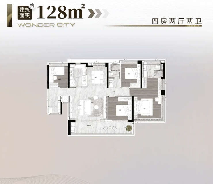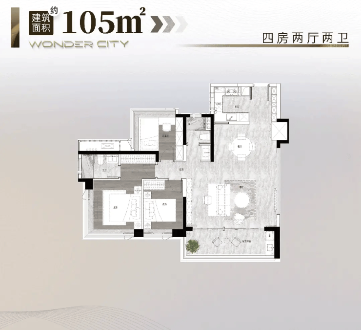 建面约 105㎡四房:480 万起,小面积实现真四房