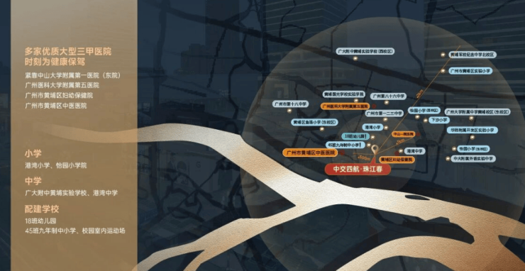 项目内部配有购物中心、总部办公、高端住宅、康养中心、生态公园等多种功能设施,同时周边还有宜家家居、山姆会员店、美林M·LIVE天地购物中心等大型商业综合体,满足居民日常生活需求。医疗方面,项目紧邻中山大学附属第一医院东院、广州医科大学附属第五医院等多家三甲医院,保障居民健康需求。此外,项目背靠蟹山公园、瓦壶岗公园、狮山公园等珍贵的自然公园资源,营造出宜居的生活环境。