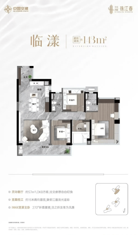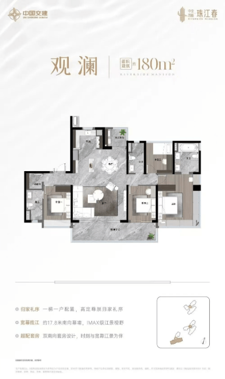 中交四航·珠江春首推的6#、7#、8#栋,户型面积主要为130-180平方米的大平层产品。全南向的设计使得每个房间都能享有充足的采光和通风条件,加上新规后的超高使用率,提升了居住品质。例如,3梯3户的设计确保了圈层的纯粹性,更匹配高阶人群的居住需求。