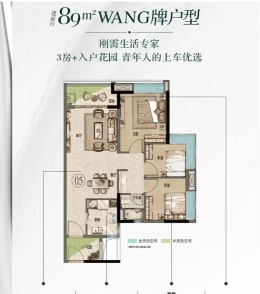 90–99㎡三房两卫:竖厅设计,部分单位南北通透,主卧带飘窗,适合三口之家;
