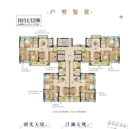 106–122㎡四房两卫:横厅或大面宽设计,LDK一体化,主卧套房+双阳台,满足二胎或三代同堂需求。