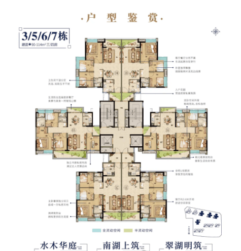 项目主力户型为90㎡、99㎡、106㎡、114㎡、122㎡,全部精装交付,强调家庭实用性: