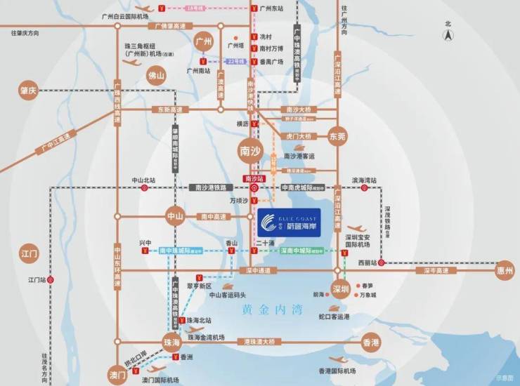 南沙区中交蔚蓝海岸雄踞南沙万顷沙二十涌核心区域,地处粤港澳大湾区黄金内湾战略核心,是国家新区、自贸试验区与粤港澳全面合作示范区三区叠加的战略要地,享受多重政策红利加持,区域发展潜力巨大。交通方面,项目坐拥“海陆空铁”一体化立体交通网络,实现大湾区1小时通勤圈: