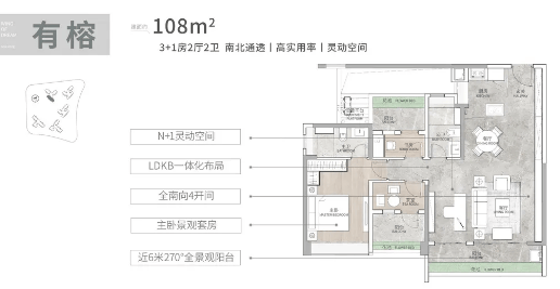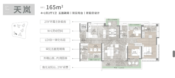 项目主推 108-165㎡三至五房,使用率近 100%,3.1 米层高 + 全景落地窗设计,采光与空间感俱佳。108㎡3+1 房为改善入门款,四开间朝南,近 6 米南向阳台 + 270° 景观,LDKB 一体化大方厅,主卧带独立卫浴与 L 型衣帽间,适配三口之家;128-140㎡四至五房为明星户型,128㎡设 8 米 L 型阳台 + 南北对流,140㎡南向采光面达 15.7 米,双阳台设计,满足多代同堂需求;165㎡5 房大平层为顶改旗舰款,17.4 米南向面宽 + 9 米 L 型景观阳台,双主套 + 中式厨房 + 西式岛台,三面望山景,主卧 270° 折叠屏飘窗,适合高净值家庭,全户型均以 “空间灵动 + 观景最大化” 为核心,贴合低密山居需求。