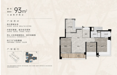 三开间南向,采光面达 8 米,客厅连接南向阳台,主卧带飘窗,空间通透明亮;