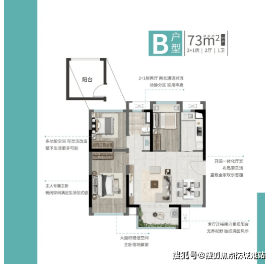73㎡ 2+1房2厅1卫,南北通透对流,动静分区,实用率高,开阔一体化厅室,布局更灵活,盛载全家欢乐志趣,客厅连接南向景观阳台,无界视野,独揽满园风华,舒适主卧,尽享生活的仪式感,多功能空间,可灵活改造,赋予生活更多可能,大面积赠送空间,主卧落地飘窗,适合三口之家居住,空间充足,舒适度高。
