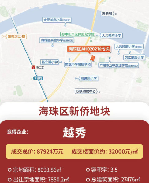 2025年1月底,越秀地产以总价8.79亿、楼面价3.2万元/平方米拿下广州市滨江中地块,成为2025年广州土地拍卖的第一拍。该项目正式命名为越秀珠实·皓悦滨江,位于海珠区滨江中路与仲恺路之间,占地面积约8000平方米,建筑面积约为4.1万平方米。项目规划了两栋住宅,首推约145户,物管费为3.7元/月/平方米。