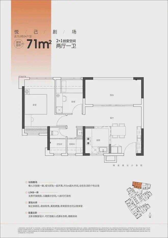 71㎡ 2+1创变空间:适合追求个性生活的年轻人,客厅约5米超大开间,LDKB一体设计,独立家政区,主卧双飘窗设计。