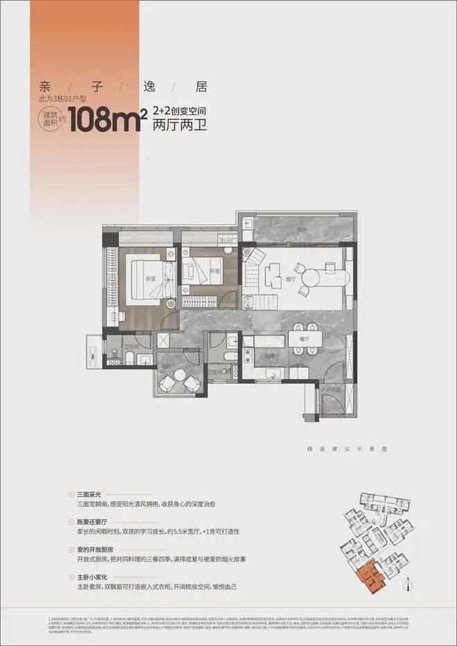108㎡ 2+2创变空间:三面宽朝南,约5.5米宽厅,开放式厨房设计,主卧小家化,提供开阔梳妆空间。