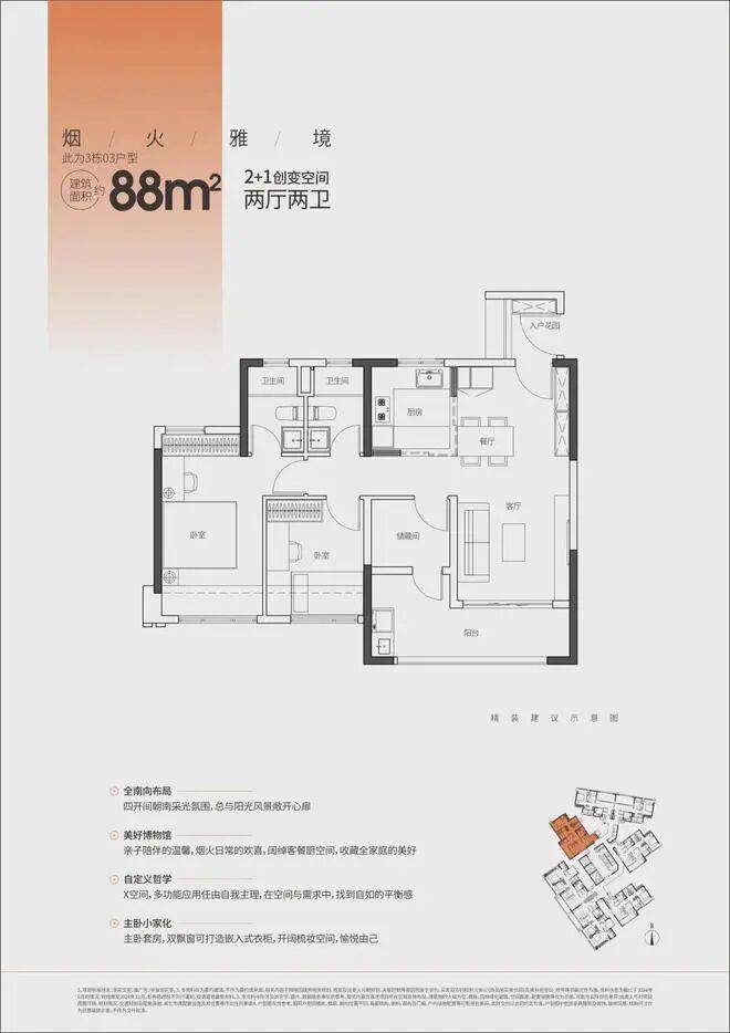 88㎡ 3房2厅2卫:全南向布局,阔绰客餐厨空间,X空间多功能应用,主卧套房设计。