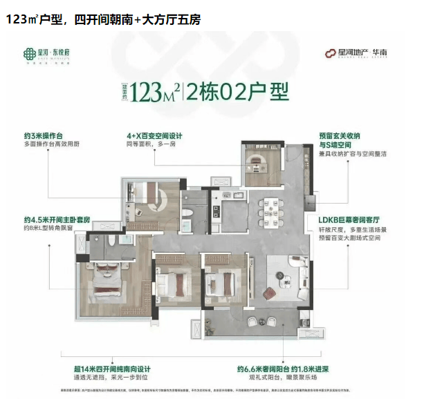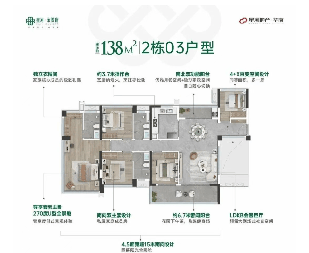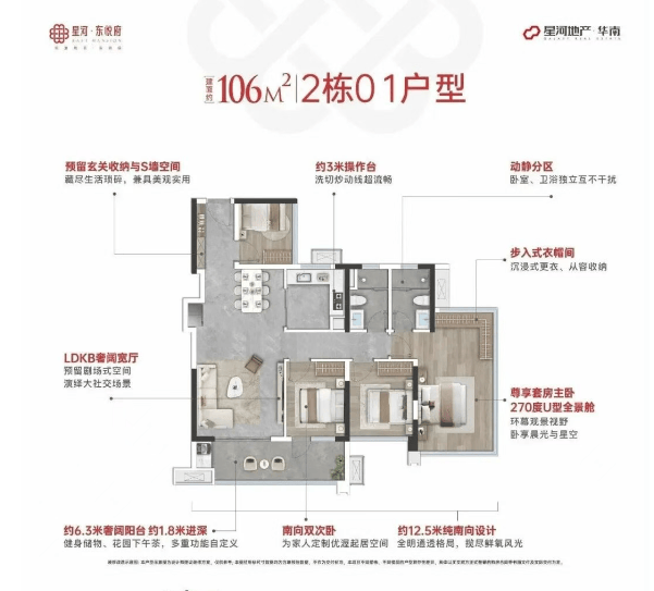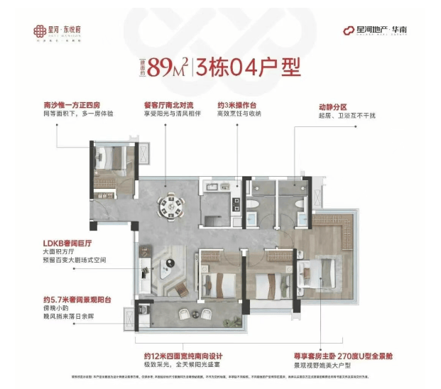 在产品设计上,星河·东悦府展现出极强的市场洞察力。主力户型为建面约89-138㎡的全四房及以上产品,精准切中改善型家庭需求。其中约89㎡户型堪称“神作”——实现罕见的南北对流+四开间朝南,在同面积段产品中几乎绝无仅有,不仅通风采光优越,更以超高得房率实现“小面积大功能”。106-122㎡户型标配6.3-6.7米大阳台,视野开阔;138㎡则打造南北对流+双主卧套房+5房格局,满足多代同堂或高端改善需求。所有户型均注重动线合理、公私分区,且多数享有“全景舱视野”,将山景、河景或城市天际线纳入日常起居。