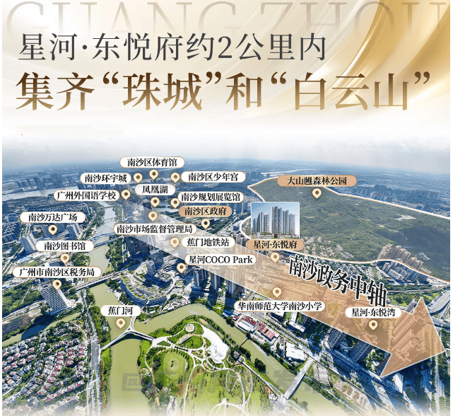 很少有城市板块能像南沙一样,自诞生起就承载着多重国家战略使命——国家级新区、自贸试验区、粤港澳全面合作示范区三重身份叠加,使其成为广州面向世界的窗口。而星河·东悦府正落子于这片热土的核心腹地:金洲-蕉门板块,这里是南沙行政、商业、教育与生态资源高度聚合的“城市客厅”。项目距离南沙区政府仅约800米,周边汇聚了全区最密集的高端市政配套,真正实现“住在政务中芯,享尽湾区红利”。在南沙GDP连续两年领跑全市、人口年增超11万的背景下,此区域已从规划蓝图跃升为现实中的价值高地,堪称“湾区之芯”的具象化呈现。