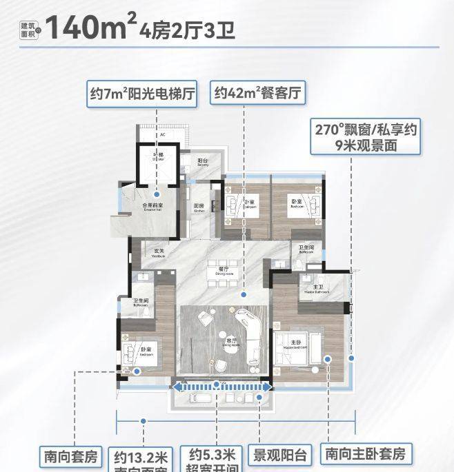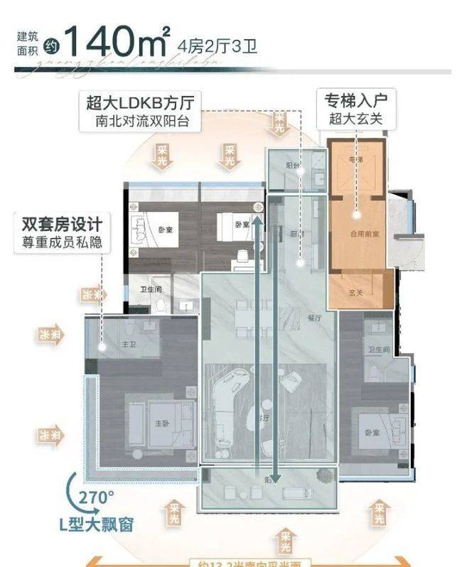 户型设计亮点满满。项目分南北地块,共 25 栋 45 - 52 米低密度小高层,“前低后高” 梯级跌落设计,尽享湖景。户型为建筑新规后产品,使用率超高。板楼设计,2 梯 2 户,近似 1 梯 1 户,私密性好。采用 LDKG 一体化设计,空间宽敞通透,减少承重墙,布局灵动。窗地比高达 38%,主卧 270° 大飘窗,采光观景极佳。如建面约 140㎡户型双主套、南北双阳台;建面约 190㎡户型南向面宽约 17 米;建面约 250㎡户型奢阔层高,一线观湖,满足不同改善需求。