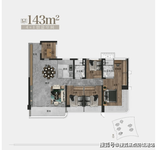 143㎡户型:高端改善四房,朝向东南,户型豪华宽敞,打造南向宽景4开间设计、约36.5M环幕采光面、270°环幕瞰景主卧与多元化功能阳台,使用率超100%,适配高端改善家庭、四世同堂大家庭的居住需求。该户型空间开阔,采光与通风条件极佳,环幕采光面让整个房间明亮通透,主卧豪华宽敞,配备独立卫生间与衣帽间,私密性极强,多元化功能阳台可用于休闲、观景、储物等,满足不同家庭的个性化需求,交标标准更高,居住舒适度堪比豪宅。