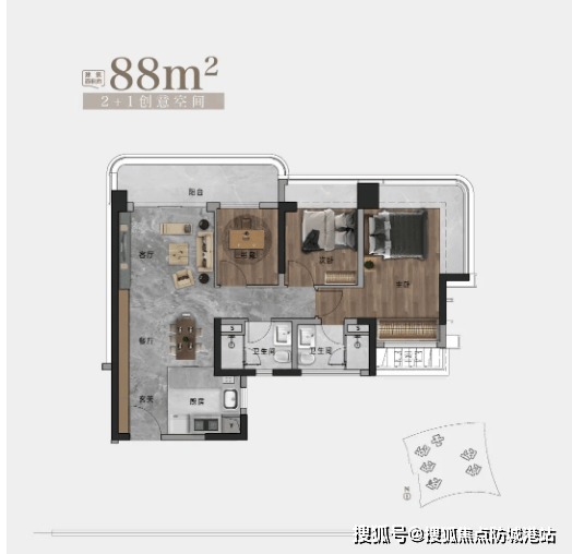 88㎡户型:刚需首选小三房,朝向西北,户型设计紧凑实用,使用率超100%,打造约5.7M巨幕阳台、270°环幕瞰景主卧与LDKB一体化设计,空间利用率极高,虽然面积不大,但功能齐全,涵盖客厅、餐厅、厨房、三个卧室、卫生间与阳台,能够满足新婚夫妻、三口之家的居住需求。其中,书房纵深约2.5米、宽约2.1米,可作为儿童房使用,摆放1.2米床后,仍有充足空间设计书桌与吊柜,不显得局促,兼顾实用性与舒适性。
