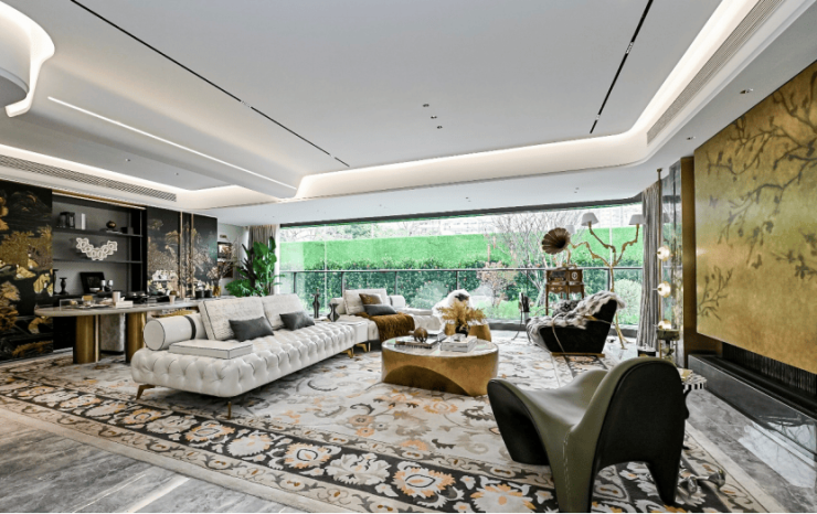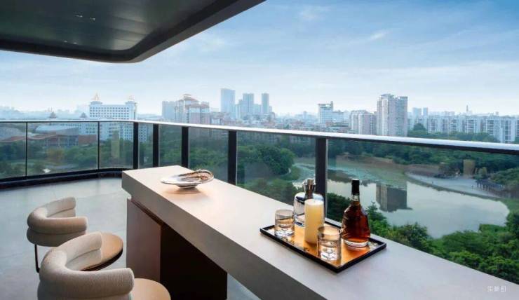 光有好看的皮囊不够,内在如何将风景引入室内才是关键。项目主力户型(约160-320㎡)普遍采用了“270°环绕飘窗+超大面宽阳台”的设计。特别是【御境】【御映】组团的约320㎡户型,拥有约15米长、270°视野的环幕阳台。站在这里,社区园林的溪流、松影与远处映月湖的粼粼波光能同时纳入眼底。室内约3.3米的层高(部分临湖户型)和LDKG一体化(客厅、餐厅、厨房、阳台贯通)的设计理念,进一步打破了室内外的界限,真正实现“宅在园中,园在宅里”的融合感。