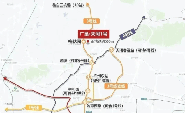 项目交通便利度极高,距离地铁3号线梅花园站B出口仅400米,两站可达广州东站,五站直通珠江新城核心商圈。同时,临近规划中的18号线京溪路站,双地铁出行选择多样。自驾方面,毗邻广州大道,2公里内可衔接沙太路、环城高速等交通干道,半小时畅达全城,一小时融入粤港澳大湾区生活圈。