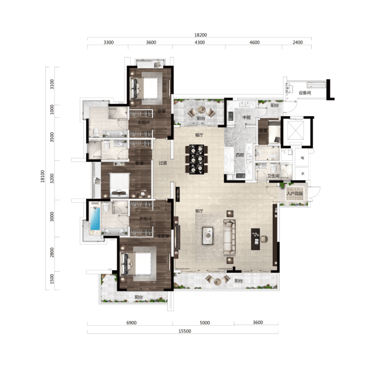 空间亮点:100㎡客餐厅一体化设计,层高3.3米,支持悬挂3米长艺术装置;主卧套间含独立书房与观景浴缸,衣帽间面积达18㎡。