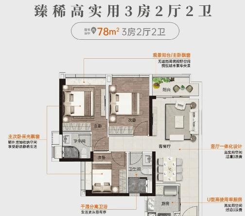 建面约78㎡/3房2厅2卫:无遮挡视野,宽敞明亮,增加了额外的收纳空间。